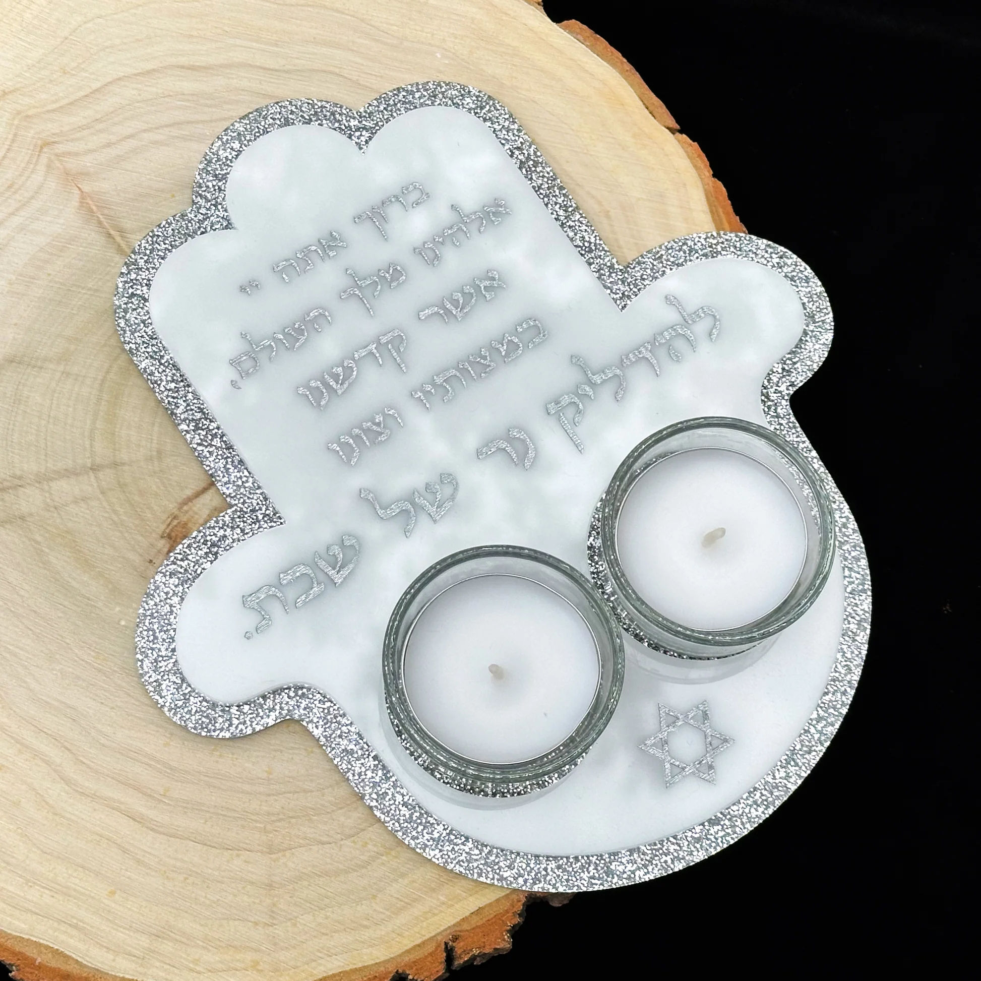 モダンなハムサルーサイト製シャバットキャンドルホルダー - カスタマイズ可能なユダヤ教の大量注文(サンプルとテスト注文可能)