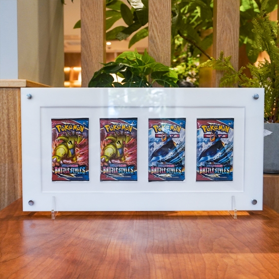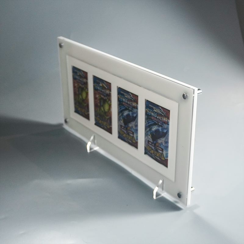このフレームの主な機能は、ポケモンカードゲーム(Pokémon TCG)のブースターパックを環境による劣化(埃、光への曝露、軽微な衝撃)から保護し、コレクション価値を維持することです。また、装飾的なディスプレイツールとしても機能し、4つのブースターパックを統一感のある美しい配置で展示することができます。さらに、卓上と壁掛けの2つの設置方法に対応しているため、ご家庭の棚からコレクションウォールまで、様々な空間にディスプレイを組み込むことができ、簡単に鑑賞したり整理したりできます。