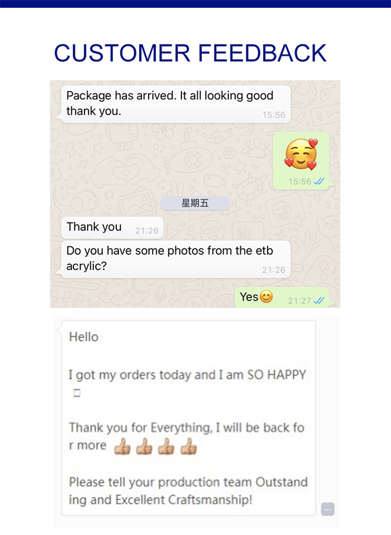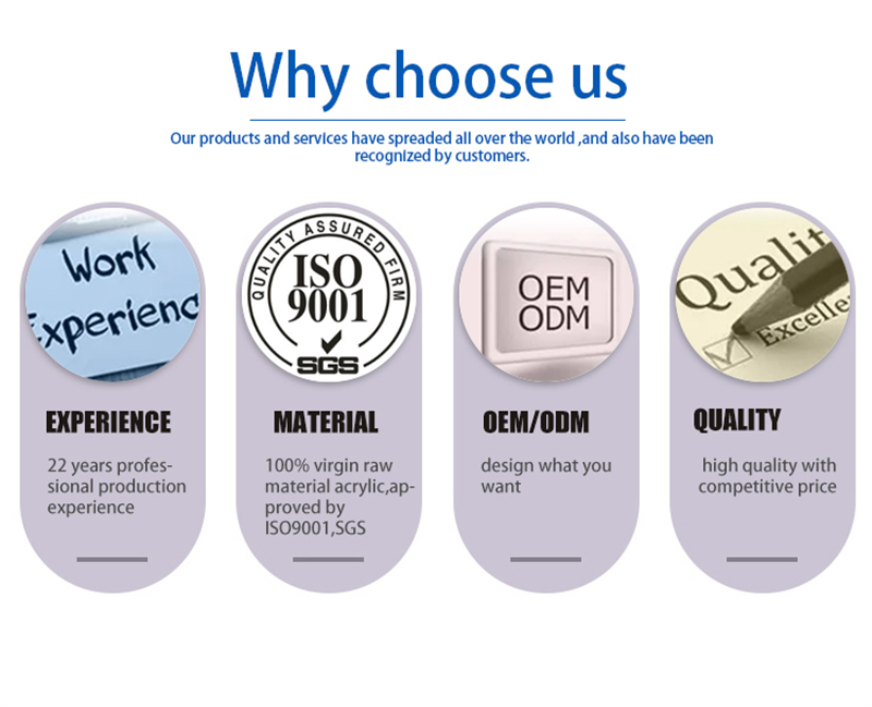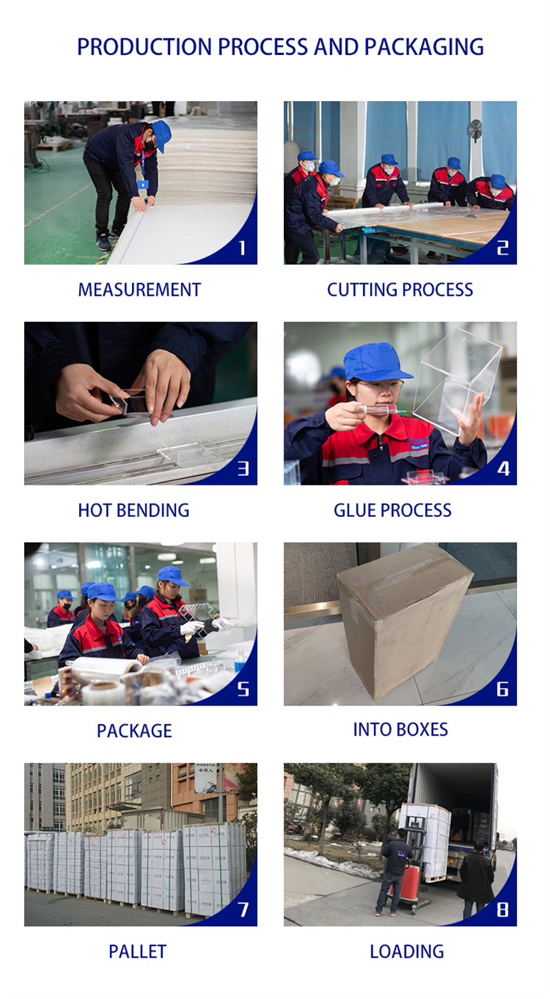 * 当社は、先進的なアクリル加工設備と技術を継続的に導入し、アクリル工芸のレベルを継続的に向上させ、先進的なツール、3次元コンピュータ彫刻の成形、レーザー彫刻、レーザー切断、切断、プロファイリング、接着、曲げ、研磨、スクリーン印刷、塗装など、完全な専門的な生産設備と技術を備えています。