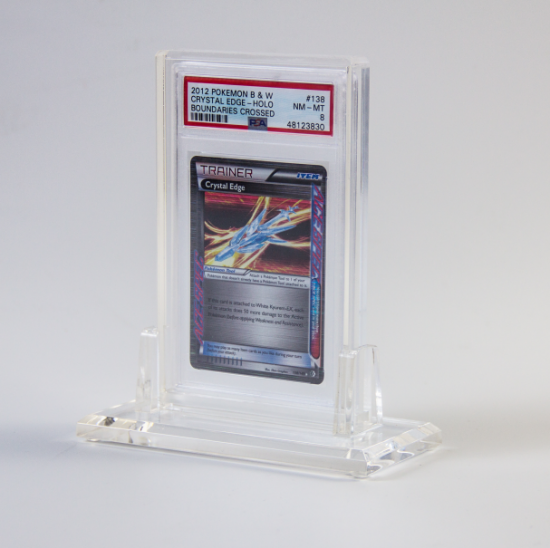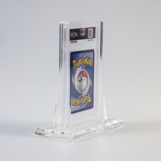 このアクリル製トロフィースタンドの主な機能は、グレーディング済みのTCGカードスラブを展示することです。スラブを高い位置にしっかりと固定し、角度を付けることで、カードのアートワークやグレーディング情報(PSAラベルの詳細など)を最大限に見やすくします。また、保護アクセサリーとしても機能し、スラブを垂直に保ち、他のアイテムから離して傷や損傷を防ぎます。さらに、貴重なグレーディング済みカードを整理し、棚、机、コレクションショーケースなどに展示しやすいように整頓できます。
