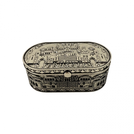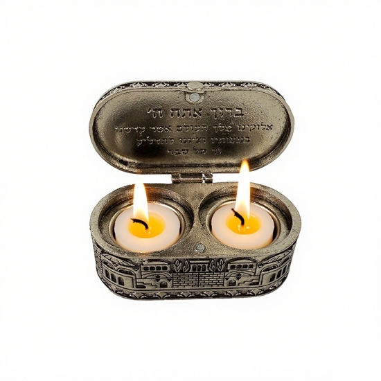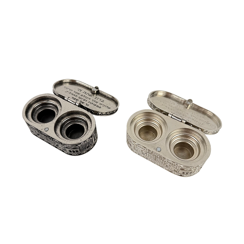 複雑な彫刻が施された耐久性のある金属製の、蓋付きのダブルキャビティキャンドルホルダーです。2 本のキャンドルを立てられる機能性と装飾性を兼ね備え、安定性のある頑丈な作り、キャンドルを清潔に保つ蓋、ユダヤ教の装飾や特別なイベントに適した文化的な魅力を備えています。